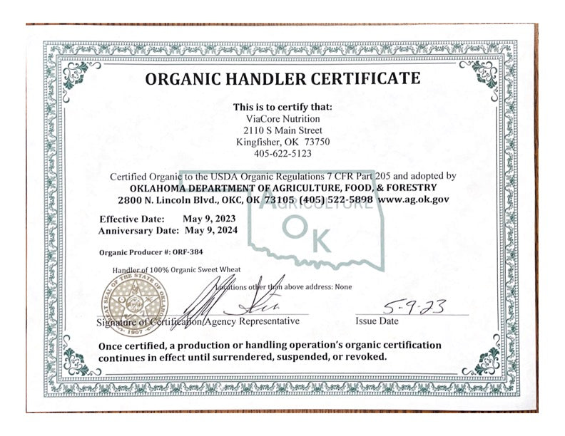Our organic products are handled in a facility certified by the State of Oklahoma as meeting organic food standards.